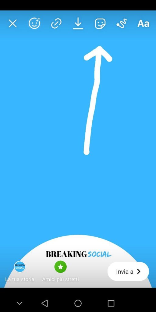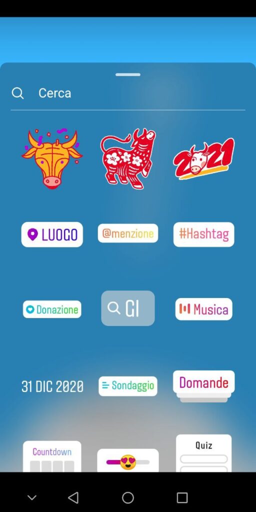 Prima di tutto registra la tua storia o scegli/scatta l’immagine da pubblicare all’interno delle tue storie. Poi pigia l’icona della “faccina”, come nello screen qui sotto, e ti appariranno in alto tre sticker dedicati proprio al bufalo.